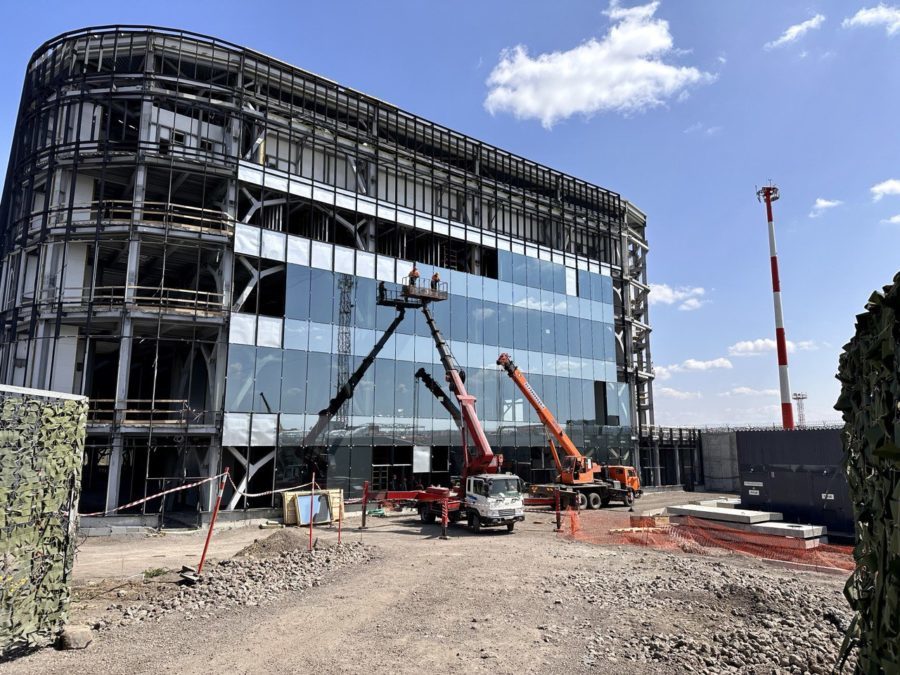 Большая часть оборудования и материалов для нового аэровокзала привезена и находится на складе, в том числе телескопические трапы, досмотровое оборудование, лифты и эскалаторы. Поставка системы обработки багажа ожидается с июля 2023 года, после чего начнется ее монтаж.