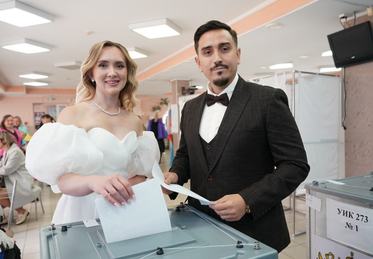 Кемеровчане Анна и Дмитрий Сабинины на свой избирательный участок в школе №85 Лесной Поляны прибыли сразу после торжественного заключения брака. Необычных гостей встречали с подарками, цветами и праздничным народным обрядом от коллектива «Славяночка». Анна и Дмитрий голосовать на один и тот же участок ходят много лет и главное событие совместной жизни на дату выборов губернатора Кузбасса назначили специально.