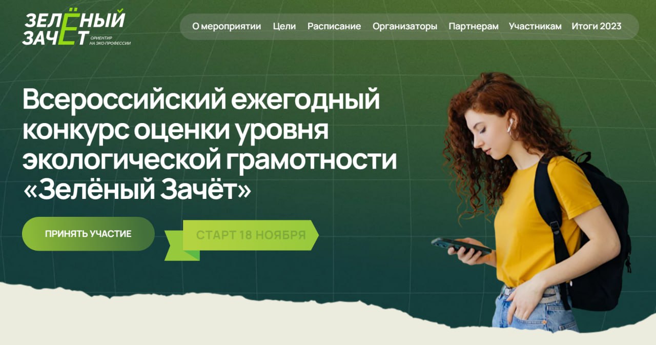 18 ноября стартовала регистрация участников Всероссийского экологического тестирования «Зеленый Зачет» от фонда «Компас». Участие в мероприятии могут принять студенты I-II курсов профессиональных образовательных организаций и учреждений высшего образования, а также школьники 8–11 классов.